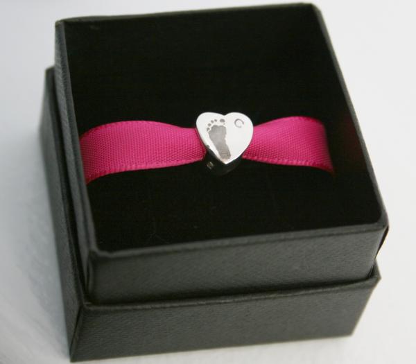 A gorgeous sterling silver pandora style charm bead engraved with a your children's or loved ones hand or footprint.